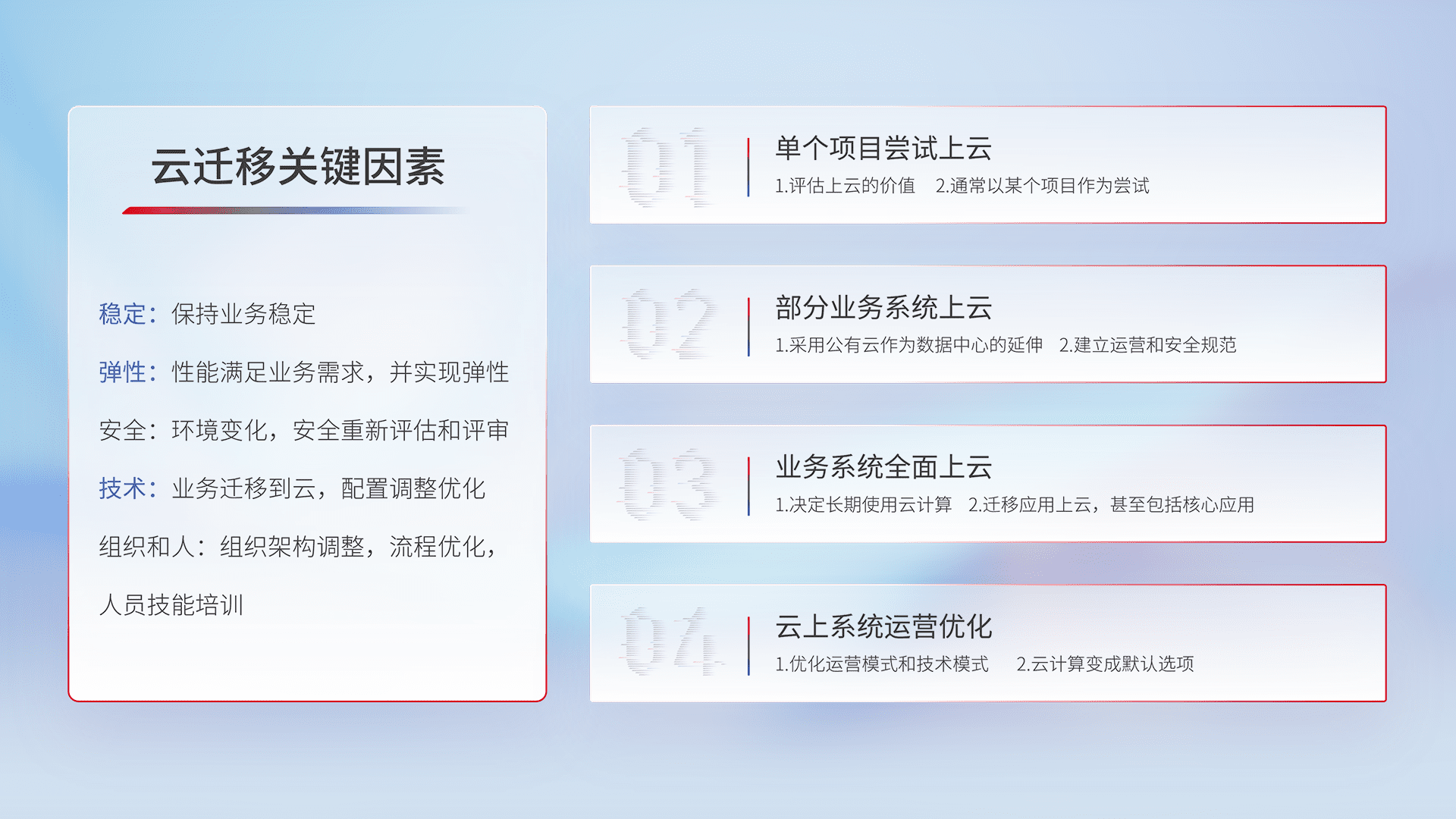 结合实际业务,,,从规划设计、、云平台选型、、云原生改造、、数据迁移、、集成交付,,迁移全过程为客户识别最佳上云路径,,,做好风险识别管理,,设计网络架构、、、身份权限、、、、安全审计合规、、、操作审计、、、日志审计、、、监控告警策略、、多站点容灾设计等,,,对云上基础设施进行整体规划,,,,提升IT治理水平,,,,以满足弹性、、高可用、、高性能的需求。。。。