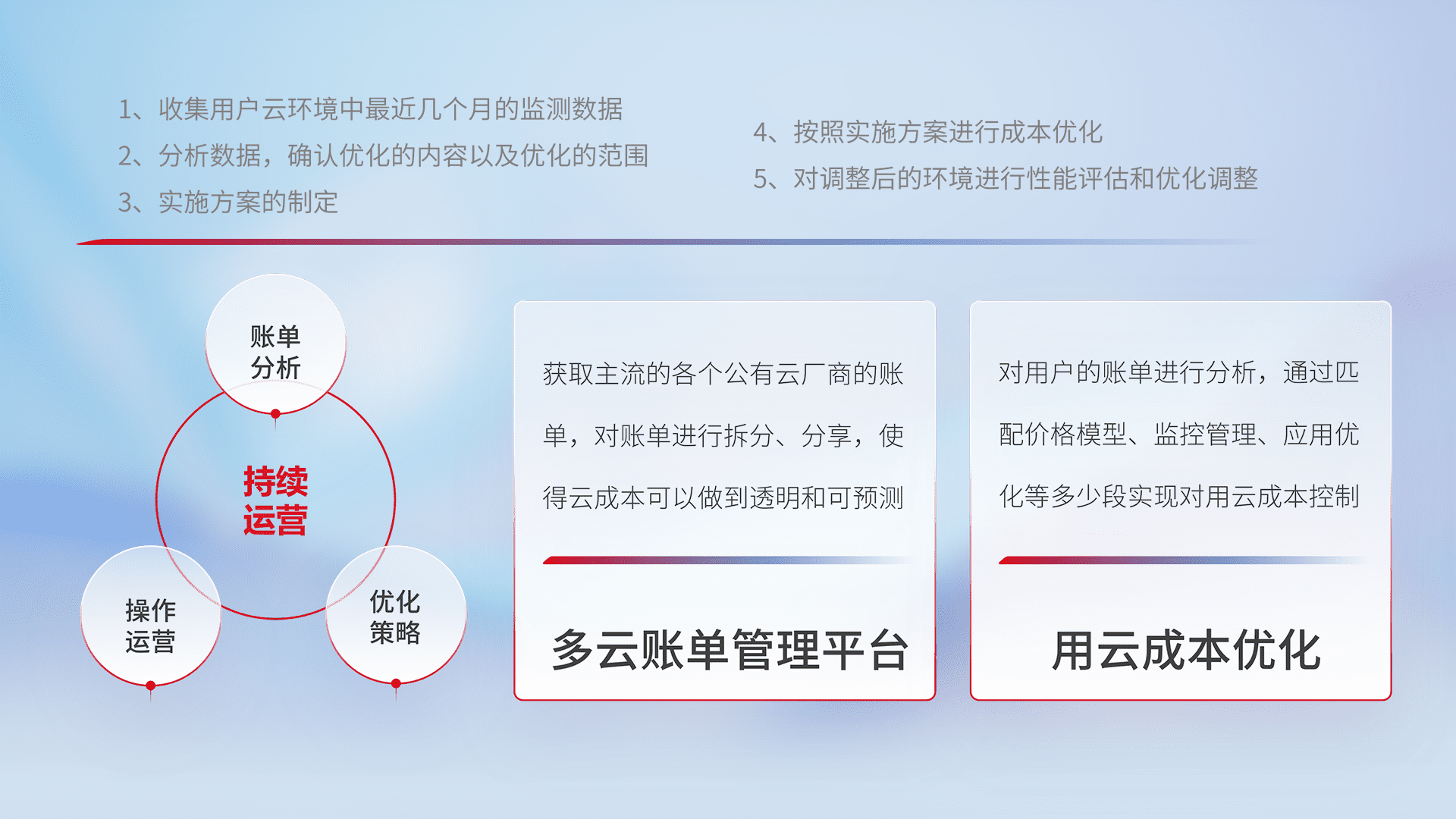 通过多云纳管,,以统一的资源数据模型把客户的云资源进行抽象和封装,,,进而实现对多云资源的统一操作,,,,保障云资源管理的可靠性、、、稳定性与可用性。。量身定制化运维内容,,,,配置、、开发运维、、、、补丁管理、、、、备份、、监控、、认证和访问管理、、、、审计和日常巡检等,,保障在用云过程中的可靠度,,稳定度以及高可用率。。。